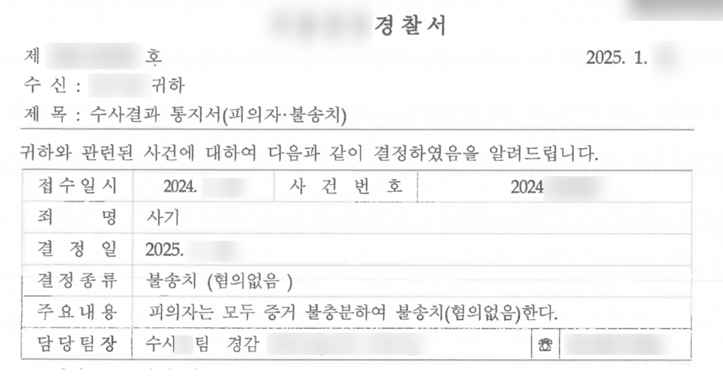 카페 운영자인 상대방은 A건설로부터 건물 1층 일부를 임차해 카페를 운영하기로 했으나, 약속된 사항이 이행되지 않았다며 사기 혐의를 주장했습니다. 그러나 수사 과정에서 A건설 대표 K씨가 처음부터 기만적 의도를 가지고 계약을 체결했다고 볼 만한 증거가 부족하다는 점이 확인되어 ‘혐의없음’ 결정이 내려졌습니다.