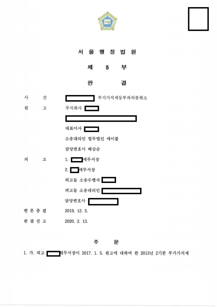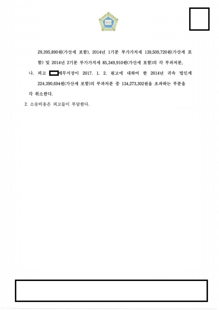 재판부는 A는 독립한 사업자이고, 위 공사가 가공거래라고 볼 수도 없다는 이유로, 원고가 취소를 구한 부가가치세 및 법인세를 모두 취소하는 승소판결을 선고하였습니다.