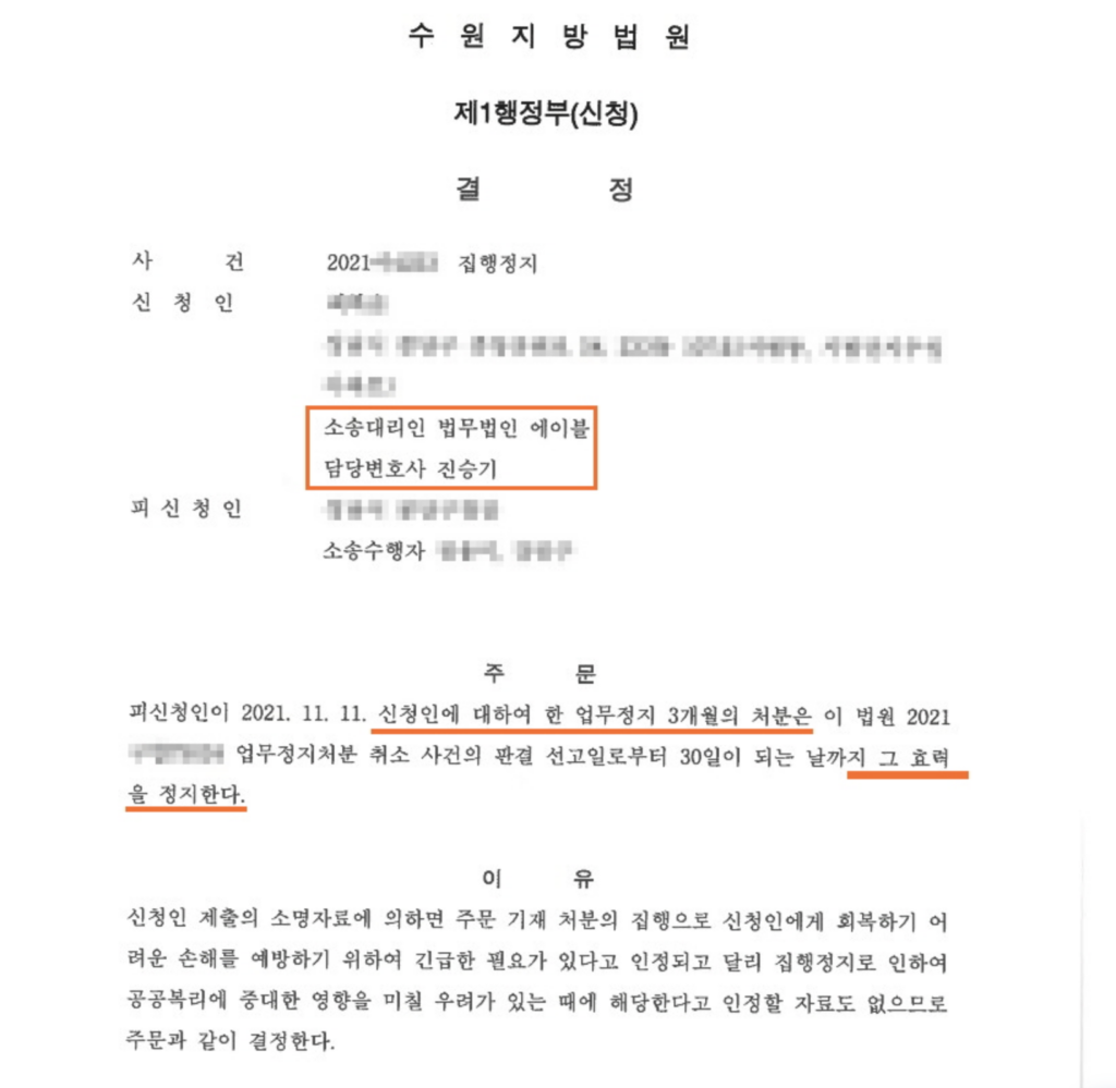 성공사례 I 업무정지처분 집행정지를 신청하여 ‘정지결정’