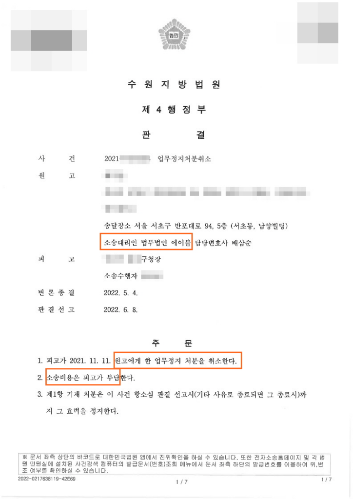 피고는 원고에게 한 업무정지 처분을 취소하며, 소송비용은 피고가 부담한다.