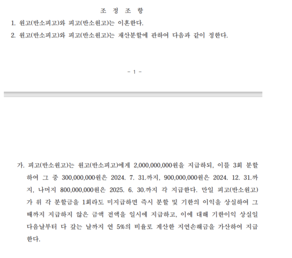 결국 조정위원의 중재와 변호인의 전략적 협상 끝에 상대방은 20억 원의 재산분할에 동의했습니다. 비록 수년에 걸쳐 분할 지급하는 조건이었지만, 판결로 진행됐다면 확보하기 어려웠을 수준의 결과였습니다.