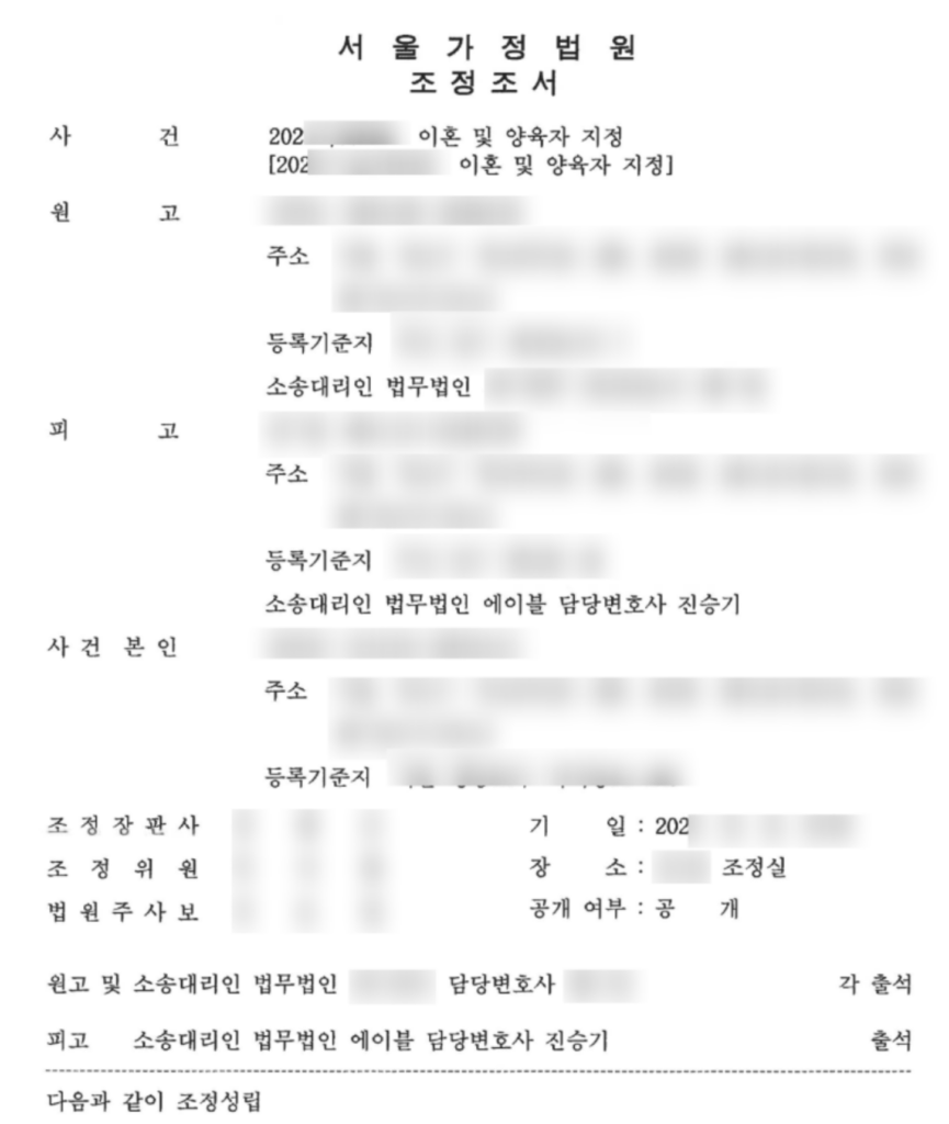 또한 각자 명의로 된 재산의 소유권을 분명하게 정리해 분쟁의 여지를 줄였고, 자녀와 관련해서는 양육비 금액과 지급 방법, 그리고 자녀를 만나는 일정(면접교섭)까지 법원에서 구체적으로 정해 안정적인 양육 환경을 마련했습니다.