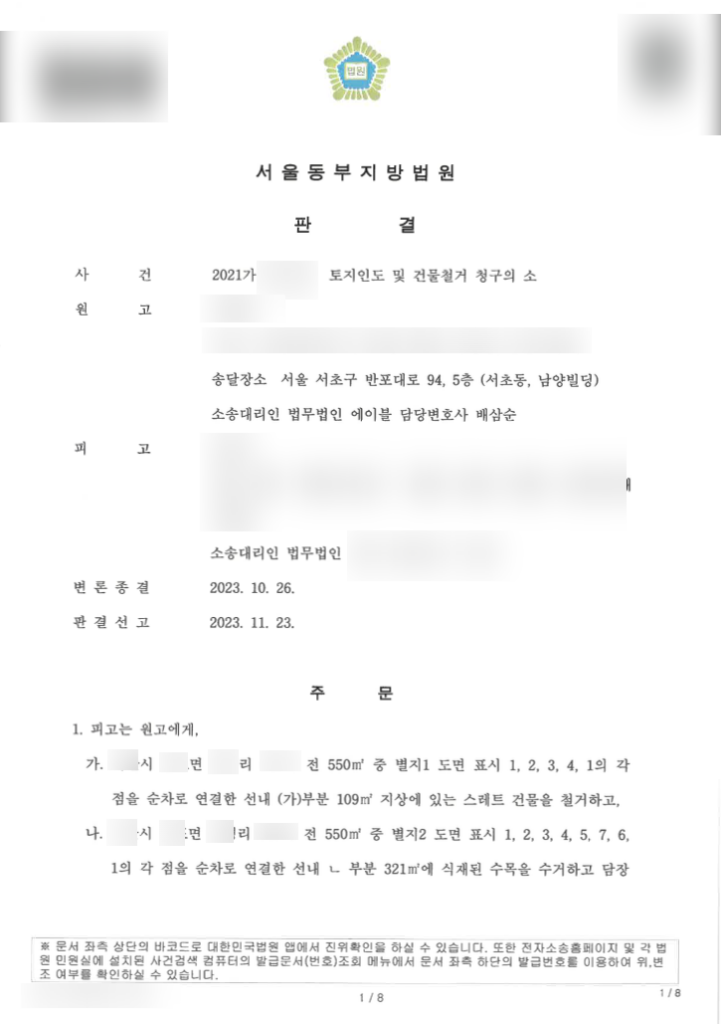 법무법인 에이블은 원고를 대리하여 피고가 무단 점유·사용 중인 토지 일부와 그 지상 시설물 철거를 요구하는 소송에서 전부 승소 판결을 이끌어낸 사례입니다. 이번 판결은 점유취득시효 주장에도 불구하고 소유권 보호가 가능함을 보여준 사례입니다.