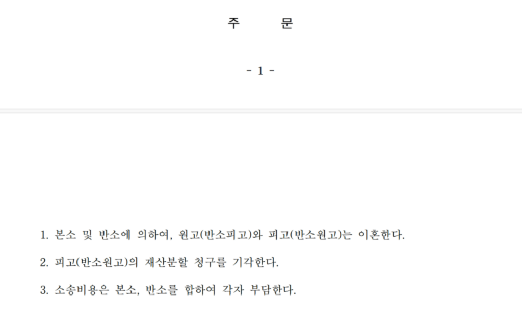 그 결과 상대방이 요구한 재산분할은 인정되지 않았고, 재산분할청구가 전부 기각되는 매우 이례적인 판결이 내려졌습니다.
