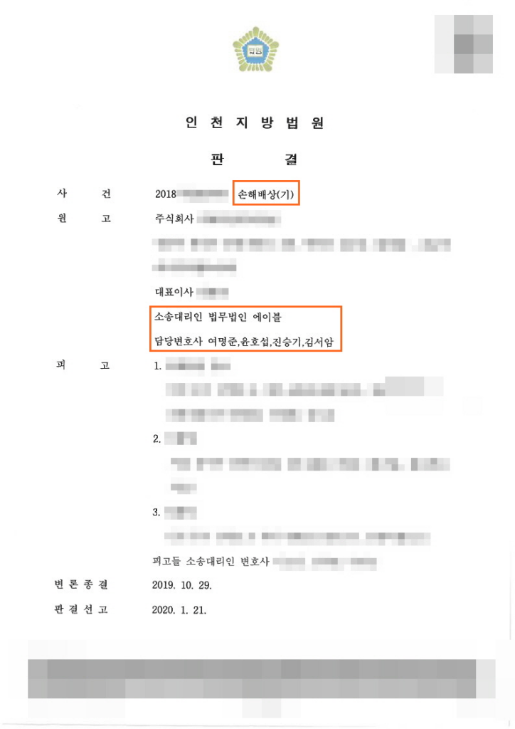 의뢰인이 주장하는 모든 사실관계가 인정되었으나 원고 측의 과실을 일부인정하여 과실상계로 일부승소로 종결됨.